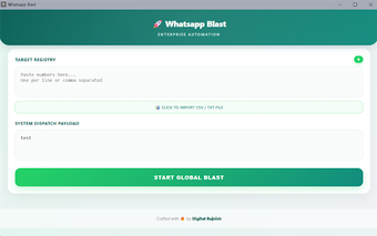Programmet har en användarvänlig design och inkluderar funktioner för att skapa personliga meddelanden genom att använda {number}-taggen för att göra varje meddelande unikt. Dessutom har Whatsapp Blast en avancerad automatiseringsmotor som säkerställer att programmet fungerar smidigt med WhatsApp-uppdateringar och inkluderar säkerhetsåtgärder som slumpmässiga fördröjningar för att skydda användarkonton från avstängningar. Idealisk för småföretagare och digitala marknadsförare, sparar detta verktyg värdefull tid.